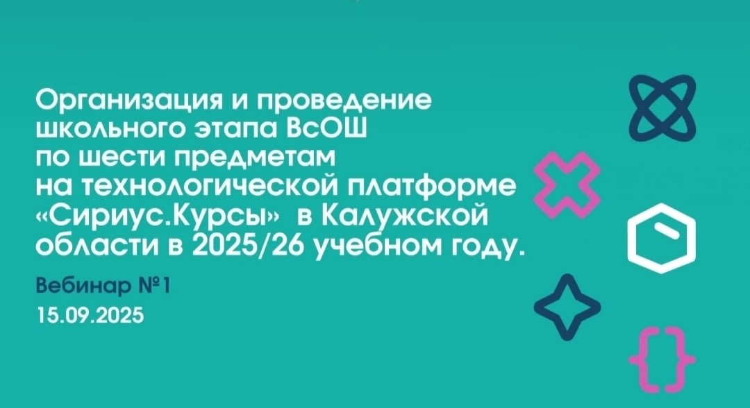 Сегодня, 15 сентября, состоялся первый установочный вебинар "Организация и проведение школьного этапа ВсОШ по шести предметам на технологической платформе «Сириус.Курсы» в 2025/26 учебном году» для специалистов местного самоуправления, осуществляющих управление в сфере образования и курирующих вопросы организации и проведения школьного этапа ВсОШ, а также ответственных педагогических работников от каждой общеобразовательной организации, осуществляющих взаимодействие с региональным координатором по вопросам проведения школьного этапа ВсОШ в СОШ Калужской области.