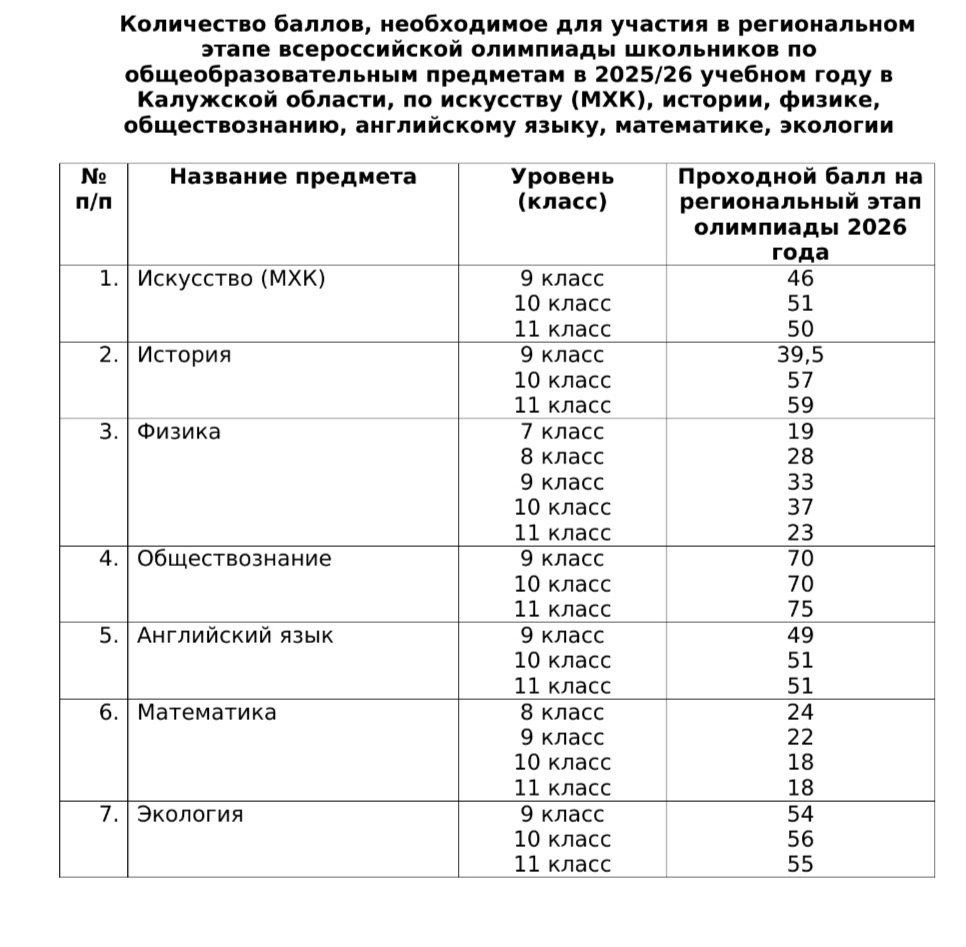 Стали известны проходные баллы еще по 7 предметам! Это необходимый минимум для перехода на следующий, региональный этап Всероссийской олимпиады школьников в Калужской области. Региональный этап стартует 12 января 2026 года.