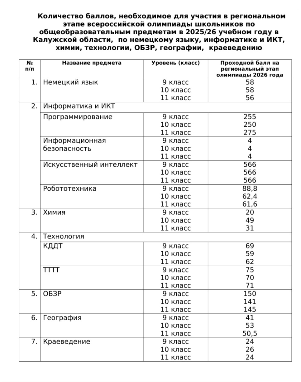 Об установлении количества баллов, необходимого для участия в региональном этапе всероссийской олимпиады школьников в 2025/26 учебном году в Калужской области, по немецкому языку, информатике и ИКТ, химии, технологии,ОБЗР, географии, краеведению
